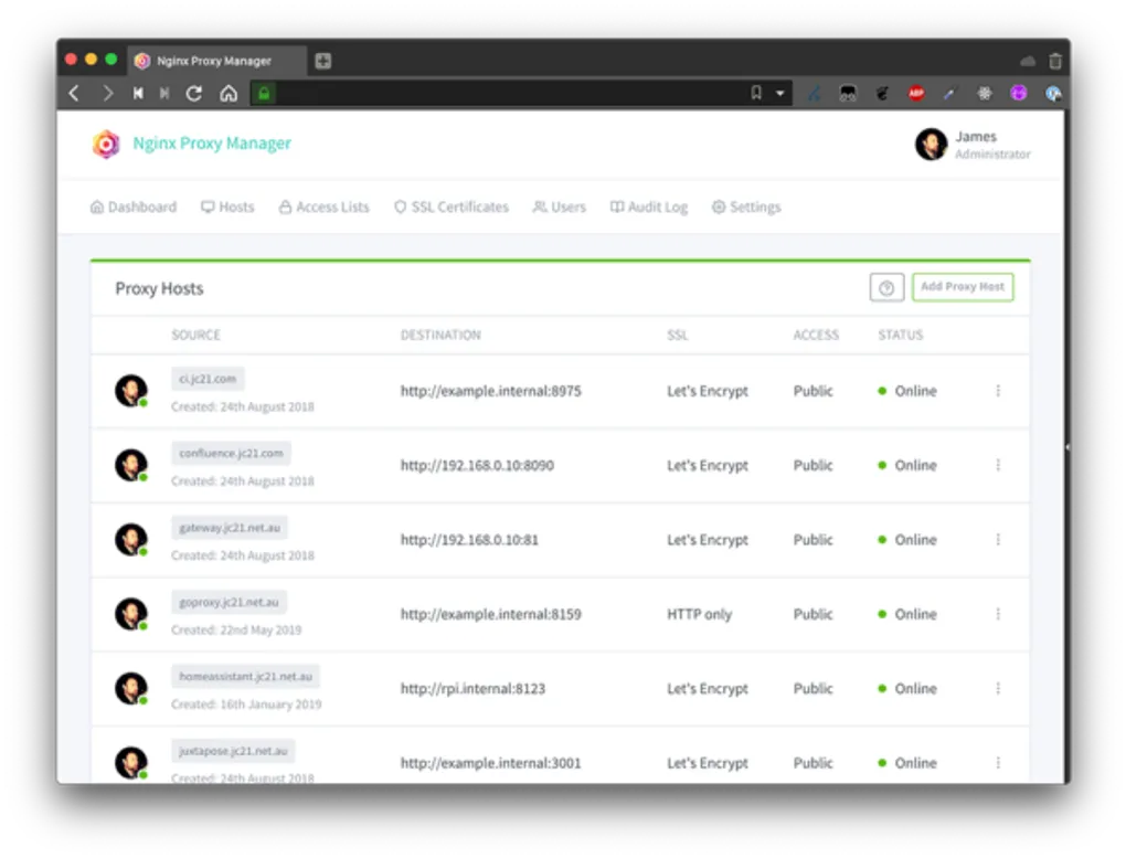 L’interface est propre. T’as des onglets pour les proxy hosts, les certificats, les access lists…